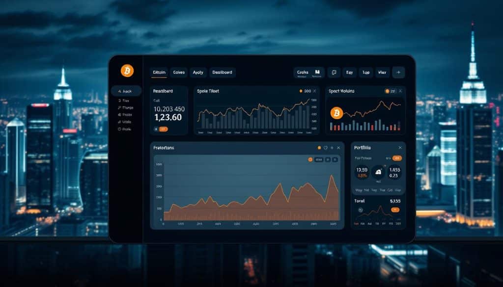 A sleek, modern dashboard interface displaying essential Bitcoin investment tools. The foreground features neatly arranged widgets and graphs tracking real-time cryptocurrency prices, trading volume, and portfolio performance. In the middle ground, a clean, minimalist design with a dark color palette and subtle animations adds depth and interactivity. The background showcases a cinematic cityscape at night, the skyline illuminated by the glow of skyscrapers and neon lights, creating a sense of urban sophistication. Soft, directional lighting casts dramatic shadows, highlighting the dashboard's clean lines and intuitive user experience. The overall atmosphere conveys a professional, cutting-edge finance application tailored for savvy Bitcoin investors.